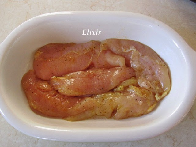 овкусено с лимонов сок,зехтин,няколко капки соев сос,млян пипер меланж,млян кориандър